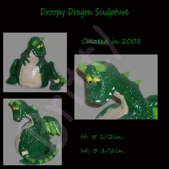 This was my first sculpture I have ever made. It is one of my favorites actually, since I love dragons and all. Out of all my sculptures I have made I think this piece has the most personality. It's is made out of clay, acrylic paint, and a glaze for the shine. The assignment was to make a sculpture from basic shapes (i.e. spheres, cubes, ect.). It is pretty good for my first sculpture and it is now sitting among my dragon sculptures that I collect.